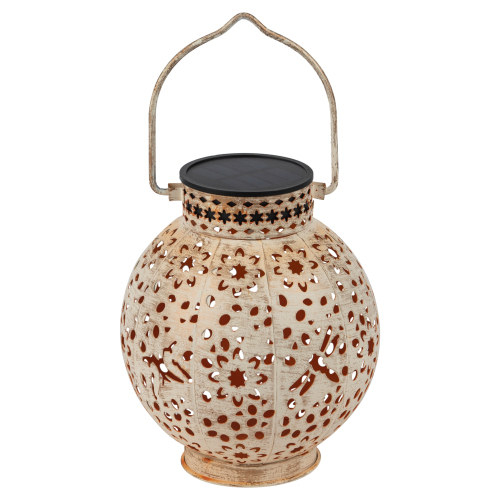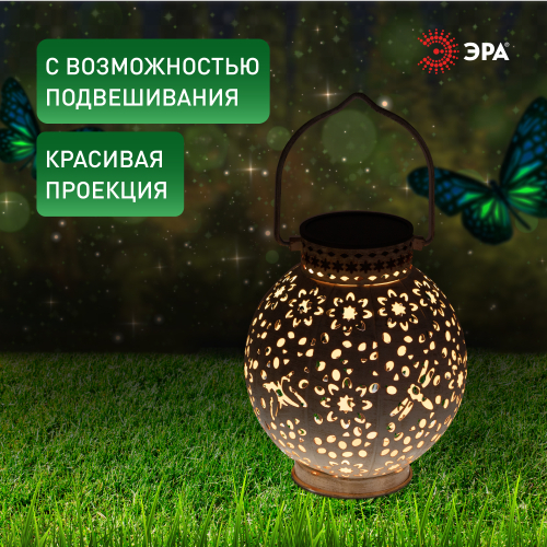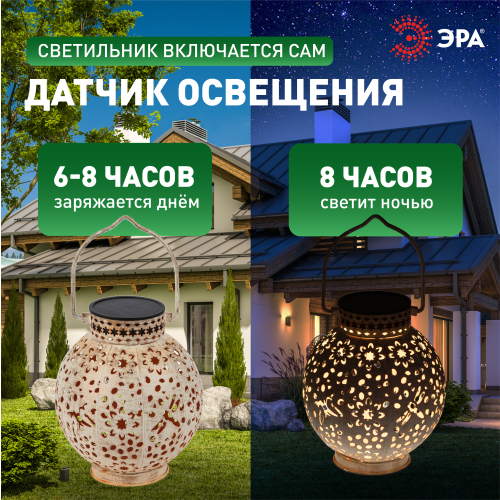 ЭРА ERASF22-59 (арт. Б0057658) - садовый светильник-амфора в турецком стиле. Встроенная солнечная батарея накапливает энергию в течение светового дня, даже в пасмурную погоду. Впечатляющий световой эффект в виде 3D-точек разного размера достигается оригинальной перфорацией плафона в форме шара. Высота уличного садового светильника - 15 см. Имеется металлический подвес-ручка для удобного переноса и быстрого размещения в любой части сада. Светильник-фонарик на солнейчной батерее окрашен стойким способом в бело-золотые оттенки с эффектом состаривания. Это придаёт светильнику особую стилистику под восточную драгоценность. Садовые светильники ЭРА "Амфора" светят уютным тёплым светом.