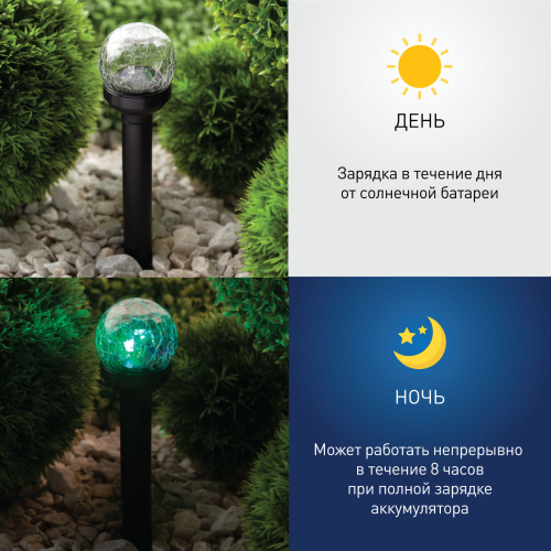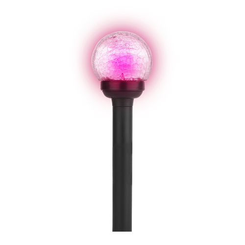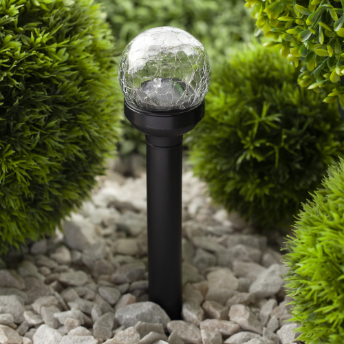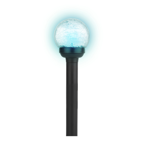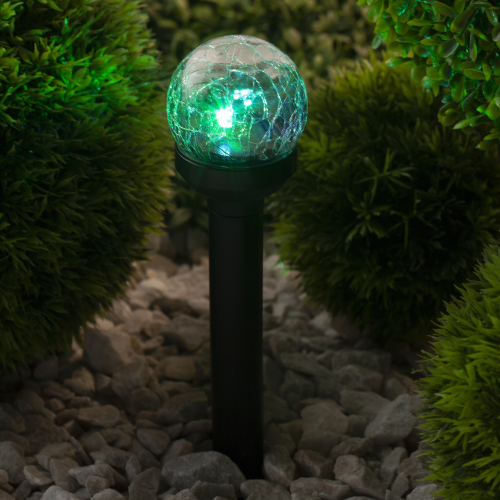 Светильник-втыкашка Кракле, в ПРОМОБОКСЕ. Диаметр стеклянного шарика 5,5 см. Основание - пластик. RGB светодиод. Поставляется в промоупаковке по 12 шт. Обращаем Ваше внимание, что перед использованием фигурки её необходимо включить и зарядить. Светильник заряжается в течение всего светового дня.