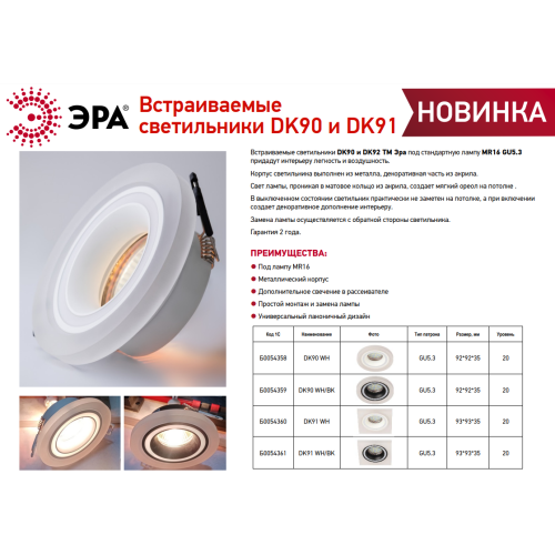 Светильник встраиваемый DK90 WH MR16/GU5.3 - превосходный выбор для вашего дома! Точечные светильники можно использовать как в качестве главного освещения, так и для создания акцентов в определенных зонах комнаты. Благодаря скрытой части корпуса светильники можно встраивать не только в потолок, но и в стены, создавая разный стиль помещений. Светильник ЭРА с приятным дизайном подойдет для комнат с разным интерьером: от лофта до модерна, классицизма или минимализма. При помощи точечных светильников можно освещать только те участки помещения, которыми вы пользуетесь в данный момент, не затрачивая лишнюю элеткроэнергию. Максимальная мощность лампы составляет 50 Вт. Корпус встраиваемого светильника изготовлен из алюминия, что делает его особенно удобным и надежным в использовании. Диаметр отверстия, требуемого для установки светильника составляет 75 миллиметров, а размер корпуса светильника – 92x35 миллиметров. Цоколь под лампу GU5.3 входит в комплект. Купив точечный светильник бренда ЭРА, вы останетесь довольны и сможете создать приятную атмосферу и уют в Вашем доме! Внимание: лампа не входит в комплектацию.
