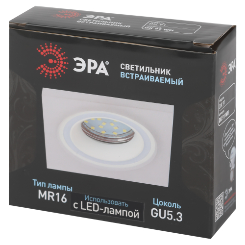 Светильник встраиваемый DK91 WH MR16/GU5.3 - отличный выбор для любого помещения в вашей квартире! Точечные светильники подходят как для основного освещения, так и для создания акцентов в определенных зонах комнаты. Благодаря скрытой части корпуса светильники можно встраивать не только в потолок, но и в стены, создавая разный стиль помещений. Светильник ЭРА с приятным дизайном подойдет для комнат с разным интерьером: от лофта до модерна, классицизма или минимализма. При помощи точечных светильников можно освещать только те участки помещения, которыми вы пользуетесь в данный момент, не затрачивая лишнюю элеткроэнергию. Максимальная мощность лампы составляет 50 Вт. Корпус встраиваемого светильника изготовлен из алюминия, что делает его особенно удобным и надежным в использовании. Диаметр отверстия, требуемого для установки светильника составляет 75 миллиметров, а размер корпуса светильника – 93x93x35 миллиметров. Цоколь под лампу GU5.3 входит в комплект. Купив точечный светильник бренда ЭРА, вы останетесь довольны и сможете создать приятную атмосферу и уют в Вашем доме! Внимание: лампа не входит в комплектацию.