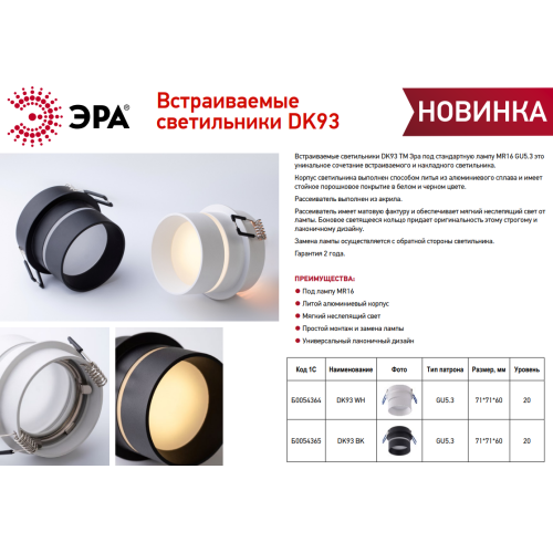 Светильник встраиваемый DK93 WH MR16/GU5.3 - замечательное решение для любой комнаты в вашем доме! Точечные светильники можно использовать как в качестве основного освещения, так и для создания акцентов в определенных зонах комнаты. Благодаря скрытой части корпуса светильники можно встраивать не только в потолок, но и в стены, создавая разный стиль помещений. Светильник ЭРА с приятным дизайном подойдет для комнат с разным интерьером: от минимализма до хай-тека, прованса или скандинавского стиля.При помощи точечных светильников можно освещать только те участки помещения, которыми вы пользуетесь в данный момент, не затрачивая лишнюю элеткроэнергию. Максимальная мощность лампы составляет 12 Вт. Корпус встраиваемого светильника изготовлен из алюминия, что делает его особенно удобным и надежным в использовании. Диаметр отверстия, требуемого для монтажа светильника составляет 66 миллиметров, а размер корпуса светильника – 71x60 миллиметров. Цоколь под лампу GU5.3 входит в комплект. Купив точечный светильник бренда ЭРА, вы останетесь довольны и сможете создать приятную атмосферу и уют в Вашем доме! Внимание: лампа не входит в комплектацию.