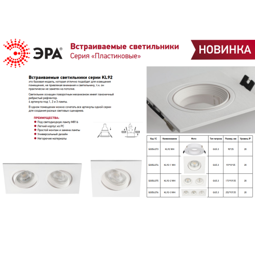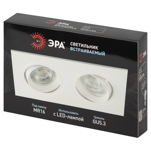 Светильник встраиваемый KL92-2 WH MR16/GU5.3 - отличный выбор для любого помещения в вашей квартире! Точечные светильники подходят как для основного освещения, так и для создания акцентов в определенных зонах комнаты. Благодаря скрытой части корпуса светильники можно встраивать не только в потолок, но и в стены, создавая разный стиль помещений. Светильник ЭРА с приятным дизайном подойдет для комнат с разным интерьером: от лофта до модерна, классицизма или минимализма. При помощи точечных светильников можно освещать только те участки помещения, которыми вы пользуетесь в данный момент, не затрачивая лишнюю электроэнергию. Максимальная мощность лампы составляет 11 Вт. Корпус встраиваемого светильника изготовлен из термостойкого пластика, что делает его особенно удобным и надежным в использовании. Диаметр отверстия, требуемого для установки светильника составляет 80x160 миллиметров, а размер корпуса светильника – 173x93x25 миллиметров. Цоколь под лампу GU5.3 входит в комплект. Купив точечный светильник бренда ЭРА, вы останетесь довольны и сможете создать приятную атмосферу и уют в Вашем доме! Внимание: лампа не входит в комплектацию.