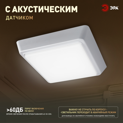 Универсальный пылевлагозащищённый LED-светильник для освещения помещений с повышенной влажностью, лестничных клеток, балконов, подвалов, технических и подсобных помещений. А также для бытового использования над крыльцом, на балконе, в подвале, в хозблоке, в гараже. Оснащен акустическим датчиком. Акустический порог активации 60дБ. Время работы после активации 40-55 сек