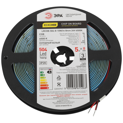 Лента светодиодная ЭРА LRCOB-504-8 10W/m 8mm 24V 6500K 3year белая 5 м со степенью защиты от пыли и влаги IP20 - современный способ создания внутреннего освещения, подсветки ниш, лестничного пространства, систем хранения, а также декоративного и художественного оформления любых объектов и форм в помещениях. Светодиодная СОВ лента сплошной засветки без видимых светодиодов. Легко и быстро устанавливается на любой гладкой поверхности с помощью скотча, расположенного на оборотной стороне ленты Используя алюминиевый профиль, можно создавать необычные и функциональные решения освещения в Вашем интерьере. Рабочее напряжение ленты составляет 24В, а мощность равна 10 Вт/м. Светодиодная лента обладает световым потоком 850 Лм/м, и цветом свечения - холодный белый (6500 K)