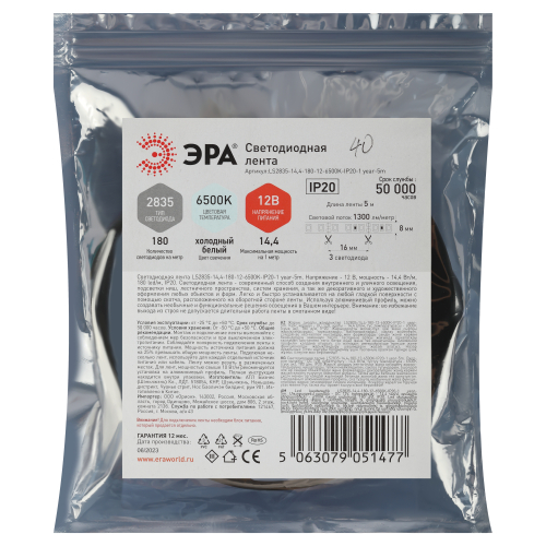 Светодиодная лента ЭРА LS2835 -14,4-180-12-6500K-IP20-1 year-5m холодный белый 5м со степенью защиты от пыли и влаги IP20 - современный способ создания внутреннего освещения, подсветки ниш, лестничного пространства, систем хранения, а также декоративного и художественного оформления любых объектов и форм в помещениях. Легко и быстро устанавливается на любой гладкой поверхности с помощью скотча, расположенного на оборотной стороне ленты. Используя алюминиевый профиль, можно создавать необычные и функциональные решения освещения в Вашем интерьере. Рабочее напряжение ленты составляет 12В, а мощность равна 14,4 Вт/м. Светодиодная лента обладает световым потоком 1300 Лм/м, и цветом свечения - холодный белый (6500 K)