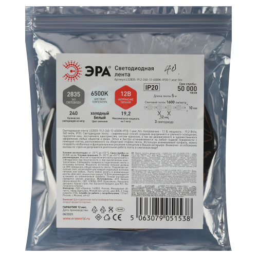 Светодиодная лента ЭРА LS2835 -19,2-240-12-6500K-IP20-1 year-5m холодный белый 5м со степенью защиты от пыли и влаги IP20 - современный способ создания внутреннего освещения, подсветки ниш, лестничного пространства, систем хранения, а также декоративного и художественного оформления любых объектов и форм в помещениях. Легко и быстро устанавливается на любой гладкой поверхности с помощью скотча, расположенного на оборотной стороне ленты. Используя алюминиевый профиль, можно создавать необычные и функциональные решения освещения в Вашем интерьере. Рабочее напряжение ленты составляет 12В, а мощность равна 19,2 Вт/м. Светодиодная лента обладает световым потоком 1600 Лм/м, и цветом свечения - холодный белый (6500 K)