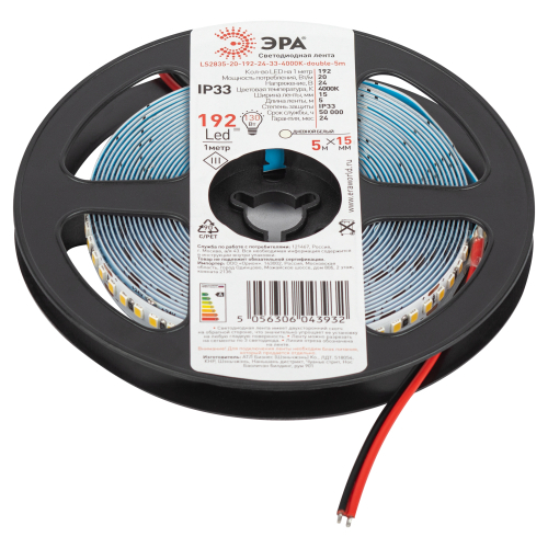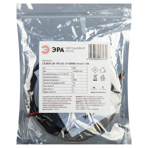 ЭРА Лента светодиодная LS2835-20-192-24-33-4000К-double-5m (25/50/300) со степенью защиты от пыли и влаги IP20 - современный способ создания внутреннего освещения, подсветки ниш, лестничного пространства, систем хранения, а также декоративного и художественного оформления любых объектов и форм в помещениях. Легко и быстро устанавливается на любой гладкой поверхности с помощью скотча, расположенного на оборотной стороне ленты Используя алюминиевый профиль, можно создавать необычные и функциональные решения освещения в Вашем интерьере. Рабочее напряжение ленты составляет 24В, а мощность равна 20Вт/м. Светодиодная лента обладает световым потоком 1300 Лм/м, и цветом свечения - дневной белый (4000 К)