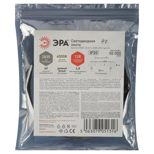 Светодиодная лента ЭРА LS2835 -4,8-60-12-4000K-IP20-1 year-5m, дневной белый, 5 м со степенью защиты от пыли и влаги IP20 - современный способ создания внутреннего освещения, подсветки ниш, лестничного пространства, систем хранения, а также декоративного и художественного оформления любых объектов и форм в помещениях. Легко и быстро устанавливается на любой гладкой поверхности с помощью скотча, расположенного на оборотной стороне ленты. Используя алюминиевый профиль, можно создавать необычные и функциональные решения освещения в Вашем интерьере. Рабочее напряжение ленты составляет 12В, а мощность равна 4,8 Вт/м. Светодиодная лента обладает световым потоком 400 Лм/м, и цветом свечения - дневной белый (4000 К)
