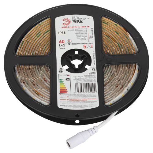Светодиодная лента ЭРА LS2835 -4,8-60-12-4000K-IP65-1 year-5m дневной белый 5м со степенью защиты от пыли и влаги IP65 - современный способ создания внутреннего освещения, подсветки ниш, лестничного пространства, систем хранения, а также декоративного и художественного оформления любых объектов и форм в помещениях с повышенным уровнем влажности и уличного освещения. Легко и быстро устанавливается на любой гладкой поверхности с помощью скотча, расположенного на оборотной стороне ленты. Используя алюминиевый профиль, можно создавать необычные и функциональные решения освещения в Вашем интерьере. Рабочее напряжение ленты составляет 12В, а мощность равна 4,8 Вт/м. Светодиодная лента обладает световым потоком 400 Лм/м, и цветом свечения - дневной белый (4000 К)