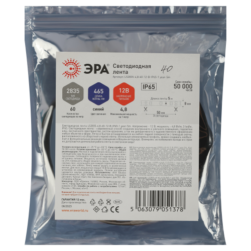 Светодиодная лента ЭРА LS2835 -4,8-60-12-B-IP65-1 year-5m, синий, 5м со степенью защиты от пыли и влаги IP65 - современный способ создания внутреннего освещения, подсветки ниш, лестничного пространства, систем хранения, а также декоративного и художественного оформления любых объектов и форм в помещениях с повышенным уровнем влажности и уличного освещения. Легко и быстро устанавливается на любой гладкой поверхности с помощью скотча, расположенного на оборотной стороне ленты. Используя алюминиевый профиль, можно создавать необычные и функциональные решения освещения в Вашем интерьере. Рабочее напряжение ленты составляет 12В, а мощность равна 4,8 Вт/м. Светодиодная лента обладает световым потоком , и цветом свечения - синий