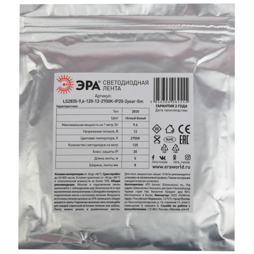 ЭРА Лента светодиодная LS2835-9,6-120-12-2700K-IP20-2year-5m (140/4200) со степенью защиты от пыли и влаги IP20 - современный способ создания внутреннего освещения, подсветки ниш, лестничного пространства, систем хранения, а также декоративного и художественного оформления любых объектов и форм в помещениях. Легко и быстро устанавливается на любой гладкой поверхности с помощью скотча, расположенного на оборотной стороне ленты. Используя алюминиевый профиль, можно создавать необычные и функциональные решения освещения в Вашем интерьере. Рабочее напряжение ленты составляет 12В, а мощность равна 9,6 Вт/м. Светодиодная лента обладает световым потоком 1050 Лм/м, и цветом свечения - теплый белый (2700 K)