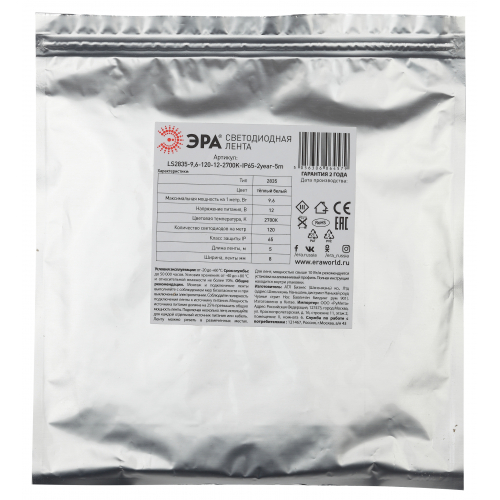 ЭРА Лента светодиодная LS2835-9,6-120-12-2700K-IP65-2year-5m (80/2400) со степенью защиты от пыли и влаги IP65 - современный способ создания внутреннего освещения, подсветки ниш, лестничного пространства, систем хранения, а также декоративного и художественного оформления любых объектов и форм в помещениях с повышенным уровнем влажности и уличного освещения. Легко и быстро устанавливается на любой гладкой поверхности с помощью скотча, расположенного на оборотной стороне ленты. Используя алюминиевый профиль, можно создавать необычные и функциональные решения освещения в Вашем интерьере. Рабочее напряжение ленты составляет 12В, а мощность равна 9,6 Вт/м. Светодиодная лента обладает световым потоком 1050 Лм/м, и цветом свечения - теплый белый (2700 K)