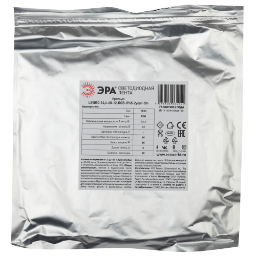 ЭРА Лента светодиодная LS5050-14,4-60-12-RGB-IP65-2year-5m (70/2100) со степенью защиты от пыли и влаги IP65 - современный способ создания внутреннего освещения, подсветки ниш, лестничного пространства, систем хранения, а также декоративного и художественного оформления любых объектов и форм в помещениях с повышенным уровнем влажности и уличного освещения. Легко и быстро устанавливается на любой гладкой поверхности с помощью скотча, расположенного на оборотной стороне ленты. Используя алюминиевый профиль, можно создавать необычные и функциональные решения освещения в Вашем интерьере. Рабочее напряжение ленты составляет 12В, а мощность равна 14,4 Вт/м. Светодиодная лента обладает световым потоком , и цветом свечения - многоцветный (620/520/465 Нм)