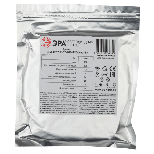 ЭРА Лента светодиодная LS5050-7,2-30-12-RGB-IP20-2year-5m (120/3600) со степенью защиты от пыли и влаги IP20 - современный способ создания внутреннего освещения, подсветки ниш, лестничного пространства, систем хранения, а также декоративного и художественного оформления любых объектов и форм в помещениях. Легко и быстро устанавливается на любой гладкой поверхности с помощью скотча, расположенного на оборотной стороне ленты. Используя алюминиевый профиль, можно создавать необычные и функциональные решения освещения в Вашем интерьере. Рабочее напряжение ленты составляет 12В, а мощность равна 7,2 Вт/м. Светодиодная лента обладает световым потоком , и цветом свечения - многоцветный (620/520/465 Нм)