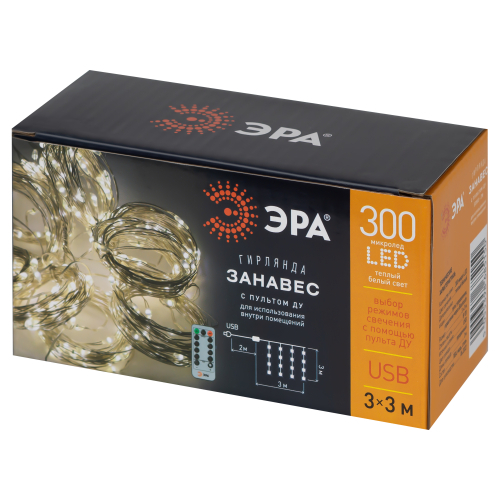 ЭРА ЕGNIG - ZW - трендовая гирлянда-занавес с микросветодиодами на тонкой незаметной леске и пультом ДУ в комплекте. Это легкое и аккуратное праздничное украшение - новый вариант популярной гирлянды-занавеса. Светящиеся занавесы выглядят очень эффектно, создавая идеальный фон для застолий и праздничных фотосессий. Новогодняя гирлянда от ЭРА, благодаря тонкой леске и миниатюрным светодиодам, выглядит невесомо и создаtт эффект крошечных светящихся звездочек. Теплое белое свечение гирлянды новогодней в формате "дождь", "занавес", "штора" - гарантия праздничного уюта в доме и эффектный фон для фотосессий, застолий, семейных ужинов. Управлять гирляндой на расстоянии дает возможность удобный пульт, поставляемый в комплекте. Вас ждут 8 режимов работы, 300 ярких современных светодиодов и максимальный комфорт в применении новогодней подсветки. Размеры занавеса: 3 х 3 м.