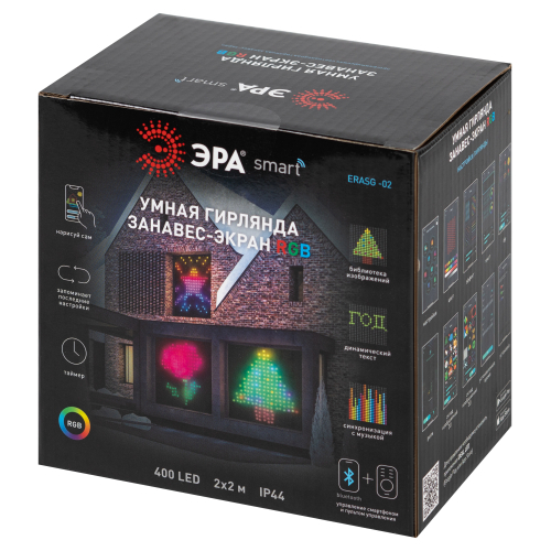 Инновационные гирлянды имеют десятки режимов работы и могут воспроизвести в цвете и в динамике любую картинку – как имеющуюся в базе, так и созданную пользователем. Смарт-иллюминация ЭРА управляется приложением или пультом ДУ, поставляемым в комплекте. Отличаются уникальным функционалом: синхронизация с музыкой, выбор любого из 256 оттенков свечения, создание уникальных сценариев подсветки, динамический текст и динамические цифры. Сотни микросветодиодов нового поколения в составе умных гирлянд ЭРА позволяют нарисовать и написать светом всё, что вам захочется! К примеру, вы можете организовать эффектный LED-отсчёт времени до наступления Нового года или написать светодиодами имя именинника на праздновании Дня рождения.