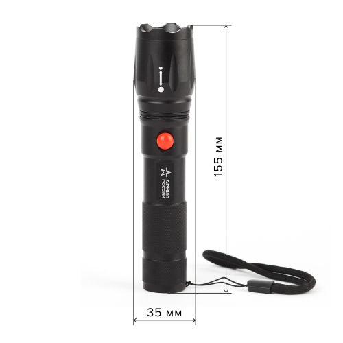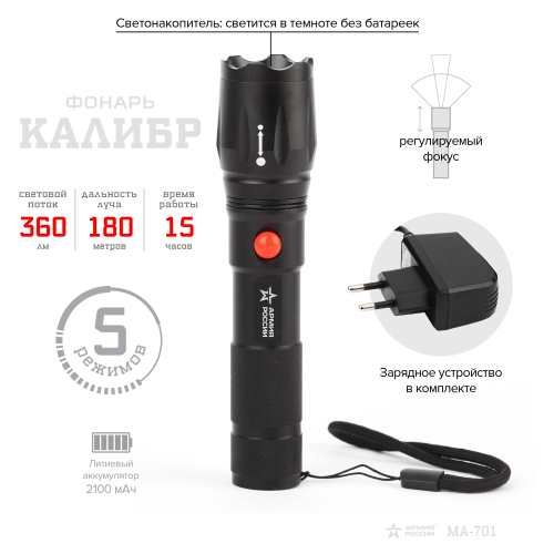 ЭРА Армия России Калибр - универсальный светодиодный аккумуляторный фонарь с лучом повышенной дальности, пятикратным зумом и встроенным светонакопителем. Его легко найти в тёмном помещении или в траве - после выключения сохраняет лёгкое свечение.Серия фонарей ЭРА Армия России - совместный проект отечественного бренда ЭРА и АО "Военторг", действующего на основании лицензии Министерства обороны РФ. ЭРА Армия России Калибр оснащён ёмким литиевым аккумулятором (2100 мАч), одного заряда которого хватает на 7 часов непрерывной работы. Зарядное устройство в комплекте. Светодиодный луч повышенной дальности имеет возможность фокусировки. Пять режимов, удобных пользователю - от ближнего заливающего света (для того, чтобы хорошенько осмотреться вокруг в темноте) до длинного направленного луча (чтобы определиться с дальнейшим направлением пути). ЭРА Армия России Калибр выглядит отлично! Благодаря необычному фактурному дизайну корпуса и тщательной сборке его приятно держать в руках, а за счёт продуманного функционала им приятно пользоваться. Фонарь украшает фирменная звезда Армии России - знак качества и особого статуса бренда. Аккуратная красная кнопка включения - дополнительный дизайнерский бонус.