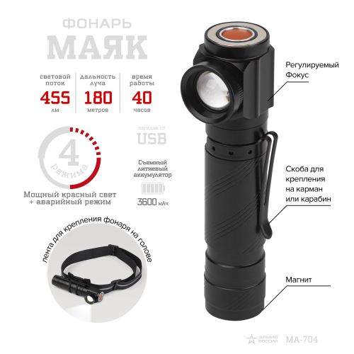Универсальный LED-фонарь АРМИЯ РОССИИ MA-704 "Маяк" (артикул Б0059495) эксклюзивной серии, выпускаемой совместно с АО "Военторг" (действует на основании лицензии Министерства обороны РФ). Корпус изготовлен из лёгкого прочного алюминия. Мощность этого многофункционального светодиодного фонаря — 10 Вт. Благодаря клипсе на корпусе фонарь АРМИЯ РОССИИ "Маяк" можно использовать как нагрудный или поясный. Благодаря мягкому ремешку, поставляемому в комплекте, данный фонарь легко трансформировать в налобный. Встроенный магнит позволяет быстро закрепить подсветку на металлической поверхности.