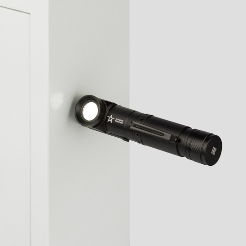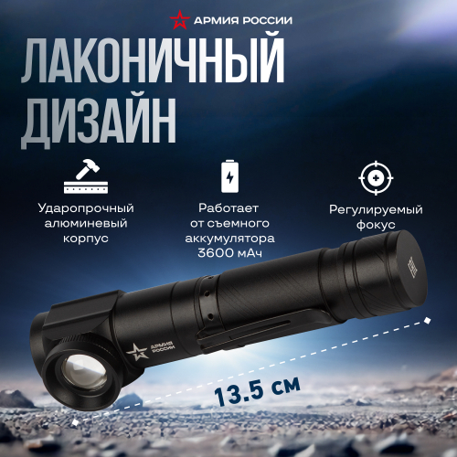 Несмотря на свои компактные размеры, фонарь оснащён мощным аккумулятором ёмкостью 3600 mAh. Аккумулятор съёмный — при необходимости его можно заменить. Подзарядка фонаря — от USB. LED-фонарь с высокой степенью пылевлагозащиты (IP65) — можно применять даже в экстремальных погодных условиях. Светодиодный фонарь линейки АРМИЯ РОССИИ отличается высоким качеством создаваемого освещения: дальность луча — до 180 м, световой поток — 455 лм, регулируемый фокус, наличие аварийного красного света. Время свечения от одной подзарядки — до 40 часов.