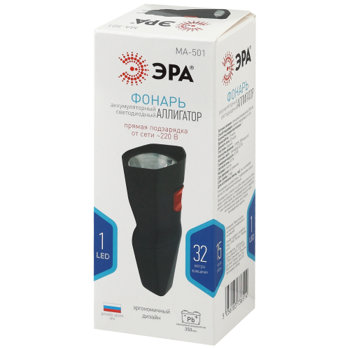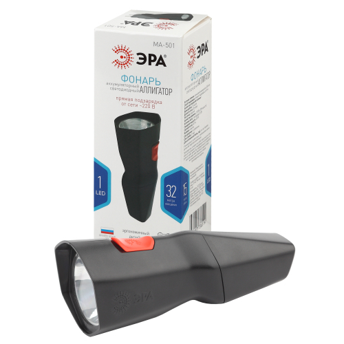 ЭРА MA-501 Аллигатор - удобный ручной фонарь собственной разработки ЭРА. Поставляется в презентабельной коробке, демонстрирующей необычный дизайн устройства. Эргономичный корпус имеет несколько граней. Фонарь отлично лежит в руке, яркая кнопка включения расположена прямо под большим пальцем. ЭРА МА-501 напрямую заряжается от электросети 220 В - не нужно брать с собой ни батарейки, ни провода для подзарядки. Вилка встроена прямо в корпус, достаточно просто снять с неё специальную защитную крышку и вставить фонарь в розетку. От одной подзарядки прибор проработает без перерыва 15 часов этого с запасом хватит на целую ночь или многодневное путешествие, если включать фонарь на несколько часов по вечерам.