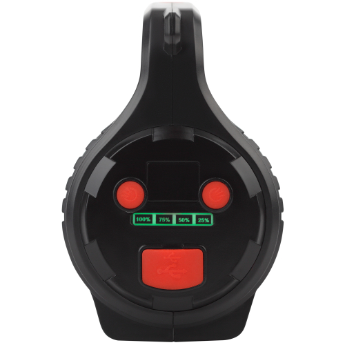 В комплекте поставляется прочный ремень для удобной переноски фонаря на плече, а также зарядное устройство с USB-выходом и microUSB-провод. Провод универсальный - используя его, можно заряжать любые мобильные гаджеты с соответствующим разъёмом. Фонарь отличается необычным дизайном со множеством деталей и выглядит очень стильно. Корпус традиционной цилиндрической формы снабжён устойчивыми ножками, благодаря которым Шмель отлично стоит на любой плоской поверхности. Ручка фонаря рифлёная с внутренней стороны - устройство отлично лежит в руке и не выскальзывает. Кнопка включения удобно расположена прямо под большим пальцем и имеет прорезиненное нескользящее покрытие. Режимы работы основного фонаря: 100% яркость (мощный светодиод 10 Вт), 50% яркость и аварийный режим мигания. Основной фонарь удобно использовать для освещения пути и подсветки дальних объектов. По бокам прожектора расположены светильники (с обеих сторон!), которые идеальны для создания ближнего заливающего освещения. Это актуально на привале или при выполнении бытовых/строительных/ремонтных работ. У каждого из светильников по 2 режима работы - максимальная яркость и эконом-освещение. Включается боковой свет при помощи кнопки на задней части корпуса. Один светильник даёт стандартный белый свет, второй отвечает за аварийное красное мигание. Устройство оснащено литиевым аккумулятором с повышенной мощностью (4500 мАч) - заряд держится свыше 5 активных часов. Имеется световой индикатор, который в процентах показывает уровень заряда и подскажет, когда потребуется очередная подзарядка.