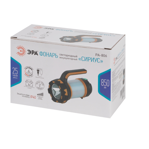 ЭРА PA-806 "Сириус" - эргономичный светодиодный фонарь-прожектор, работающий от аккумулятора. Удобно подзаряжается от USB при помощи кабеля, поставляемого в комплекте. Емкий литиевый аккумулятор 3000 мАч отлично держит заряд - 25 часов непрерывного свечения от одной подзарядки. Для удобства есть индикатор заряда. Устройство может использоваться как powerbank. Вы оцените 6 режимов свечения данного фонаря: головной свет 100% и 50% яркости; боковой светильник светит белым и красным светом разной яркости. Есть аварийное мигание красного цвета. ЭРА "Сириус" хорошо защищен от влаги и пыли - IP40. Этот фонарь-прожектор отличается высоким световым потоком - 820 Лм. Назван в честь самой яркой звезды ночного неба.