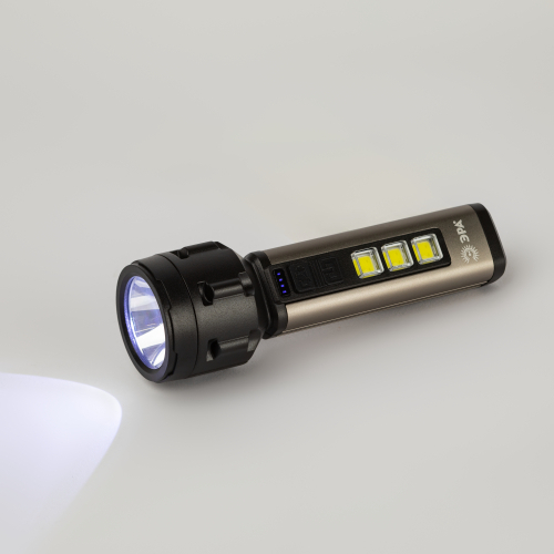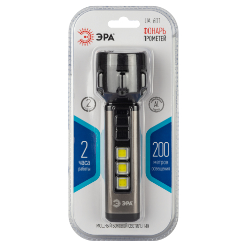 ЭРА UA-601 «Прометей» - аккумуляторный ручной фонарь с мощным 3-сегментным боковым светильником. Уникальный для российского рынка дизайн. Яркий головной луч (1 SMD-светодиод) дальностью до 200 метров помогает качественно освещать дорогу или подсвечивать конкретные предметы. Боковой светильник, состоящий из 3 компактных, но очень ярких COB-матриц с инновационными микросветодиодами, формирует широкое заливающее освещение.