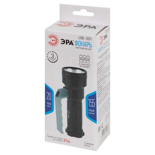 ЭРА UB-301 - компактный светодиодный фонарь с удобной съёмной ручкой, защитой от воды и 3 режимами работы: максимальная яркость, 50% яркости, стробирование. В основе SMD-диод нового поколения - не тускнеет и не требует замены с течением времени. Ручной портативный фонарь от ЭРА работает от 3 пальчиковых батареек (3 х АА, в комплект не входят). После установки новых элементов питания непрерывно светит 20 часов. Обеспечивает 155 метров освещения! Повышенный световой поток - 230 Лм. Можно применять во влажном климате, в любую погоду - IP44. Станет вашим надежным помощником в любой ситуации!