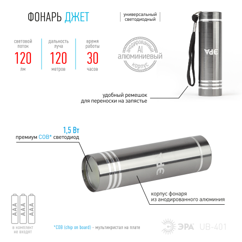 Светодиодный алюминиевый фонарь: 1,5 Вт. ,Светодиод премиум класса,до 30 часов непрерывной работы, Световой поток: 120 Лм, 3xAAA (в комплект входят)