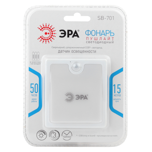 ЭРА SB-701 светодиодный фонарь-подсветка с дизайном под традиционный выключатель света. Оснащен датчиками движения и освещенности будет автоматически включаться и выключаться, когда в комнате присутствует / отсутствует движение. Этот режим можно отключить, если хотите работать с подсветкой через привычное нажатие. Датчики работают в паре: при наличии движения фонарь включается только в темноте. Это позволяет избежать ненужной подсветки при включенном основном свете. Выключается фонарь через 25 секунд после выхода человека из комнаты или коридора. Удобное и экономичное дополнительное освещение в вечерне-ночное время. Отлично подходит для использования в коридоре квартиры, будучи размещенным в одном ряду с выключателями света для ванной комнаты и туалета. Работает автономно - от трех мизинчиковых батареек (3хААА). Идеален для подсветки в шкафу, подсобке, на даче. Имеет два типа крепления - отверстие для подвешивания на гвоздь и двустороннюю самоклеящуюся липучку. Оба крепления делают фонарь очень мобильным: при необходимости его легко снять, взять с собой, что-то подсветить, а вернувшись - быстро вернуть на стационарное место. Яркий свет создает прямоугольная плата с мелкими светодиодами-мультикристалл. Есть возможность настраивать уровень яркости. Одного комплекта алкалиновых элементов питания хватает на 50 часов непрерывного освещения.