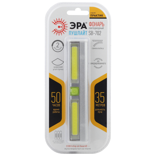 SB-702 - светодиодный фонарь-пушлайт с двумя режимами работы и несколькими типами креплений - самоклеющаяся основа, магнит, два отверстия для подвешивания на болты/гвозди. Прочный корпус из анодированного алюминия. Широкий угол светового пучка. Яркий заливающий свет, который не слепит глаза и не мерцает. Компактный фонарь-пушлайт легко крепится к любой гладкой поверхности и становится отличным решением для освещения пространств, где нет стационарного света, или для дополнительной подсветки затемнённых мест. ЭРА SB-702 размещают в подсобных помещениях, на отдалённых полках гардеробных, под кухонными шкафами. Он включается и отключается быстрым нажатием на кнопку, расположенную в центре корпуса. Повторное нажатие кнопки активирует эконом-режим с 30% яркости. Кнопка включения покрыта мягким прорезиненным материалом, препятствующим скольжению. Даёт широкое заливающее освещение при помощи двух светодиодных пластин СОВ (chip on board - мультикристал на плате), это промышленная технология, адаптированная для универсальных целей. Получился яркий, но при этом ровный мягкий свет, идеальный для бытовой подсветки. LED-платы не тускнеют со временем и не нуждаются в замене. Для того, чтобы закрепить фонарь в любом удобном месте, нужно просто отсоединить защитную плёнку и приклеить устройство с помощью прочной самоклеющейся основы. Одна минута - и вы обеспечены качественной подсветкой! На металлические поверхности ЭРА SB-702 крепится и вовсе за считанные секунды - в корпус встроен магнит. Устройство экономично - от одного комплекта батареек (3хААА) работает 50 активных часов.