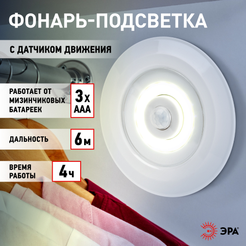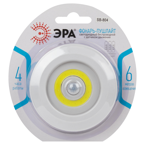 ЭРА SB-804 - светодиодный беспроводной фонарь с датчиком движения. Удобная подсветка с автоматическим включением и выключением. Эргономичный бытовой фонарик работает от мизинчиковых батареек (3 х ААА). Надежно фиксируется в любом месте и под любым углом благодаря самоклеящейся монтажной площадке. Монтируется за минуту! Для смены батареек фонарь не нужно отклеивать: легкий доступ к отсеку с элементами питания можно получить, сняв со специальных креплений верхний блок корпуса. От одного комплекта алкалиновых элементов питания данный бытовой фонарь непрерывно работает 4 часа.