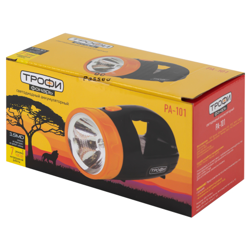 ТРОФИ РА-101 (артикул Б0053340) — светодиодный аккумуляторный фонарь-прожектор. Дальность светового луча — 75 метров. Просто и быстро заряжается — в комплекте съёмная вилка для прямого подключения к обычной сети 220 В. Одного полного заряда хватает на 7 часов непрерывной работы фонаря. Универсальный LED-фонарь прожекторный ТРОФИ РА-101 имеет эргономичную ручку с углублениями для пальцев — удобно переносить. Выпускается в красочной картонной коробке. Прекрасно подходит для подарка к любому празднику.