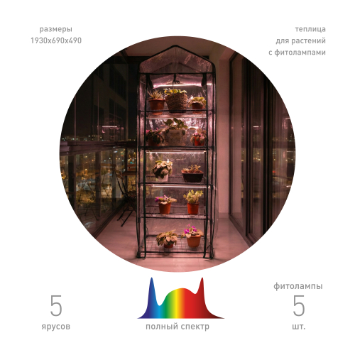 Теплица с фитосветильниками GA-House -5 отлично поместится на балконе, у окна или в любом другом месте квартиры, дома. Её габариты: 640 х 490 х 1930 мм. Высота полок - 30 см, верхний ярус имеет небольшой купол и подходит для размещения более высоких растений. Качественный и надёжный металлокаркас дополняет прочный прозрачный кожух с удобной молнией. Кожух защищает растения от сквозняков, создаёт внутри теплицы необходимый для быстрого развития растений микроклимат. Благодаря молнии кожух легко открывается для проветривания, полива, замены ящиков или горшков. Теплица очень проста в сборке, не требует специального инструмента или особых навыков - справится любой!