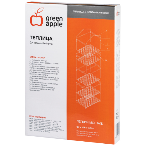 Теплица GA-House-5х-frame отлично поместится на балконе, у окна или в любом другом месте квартиры, дома. Её габариты: 640 х 490 х 1930 мм. Высота полок - 30 см, верхний ярус имеет небольшой купол и подходит для размещения более высоких растений. Качественный и надёжный металлокаркас дополняет прочный прозрачный кожух с удобной молнией. Кожух защищает растения от сквозняков, создаёт внутри теплицы необходимый для быстрого развития растений микроклимат. Благодаря молнии кожух легко открывается для проветривания, полива, замены ящиков или горшков. Теплица очень проста в сборке, не требует специального инструмента или особых навыков - справится любой! Конструкция выглядит эстетично, имеет эргономичную форму и малые размеры - всё это позволяет организовать полноценный фитокомплекс даже в небольшой квартире. GREEN APPLE GA-House-5х-frame - идеальное решение для выращивания рассады.