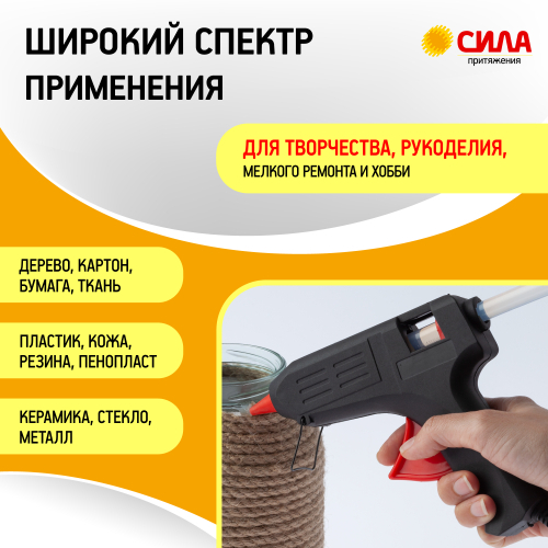 Клеевой пистолет СИЛА предназначен для прочной фиксации различных по типу материалов (дерево, керамика, пластик, картон) к поверхности по средствам расплавления клеевого стержня с последующим его застыванием.