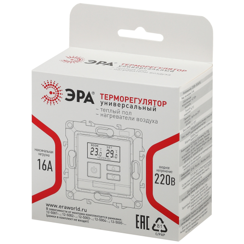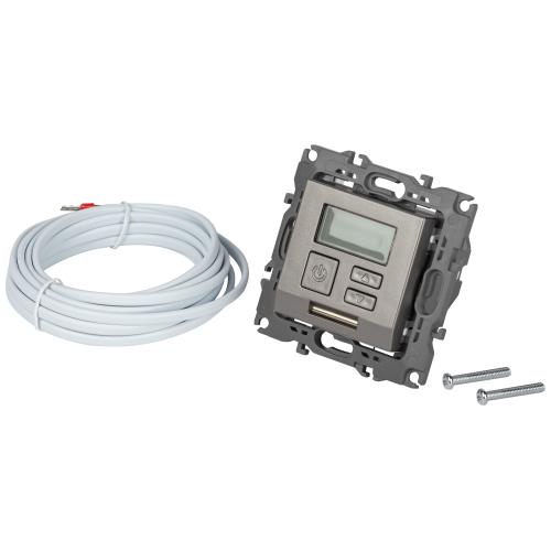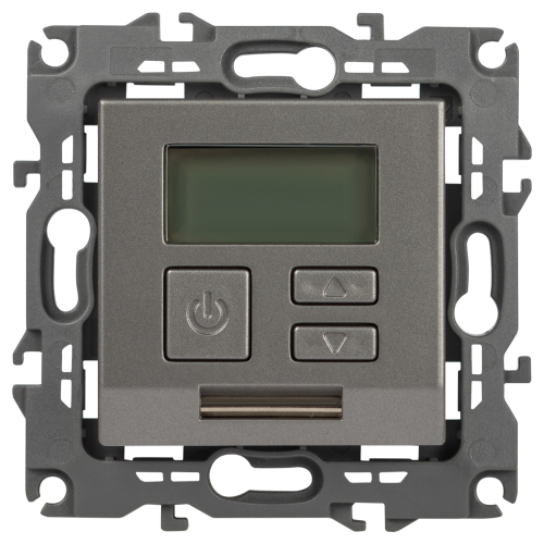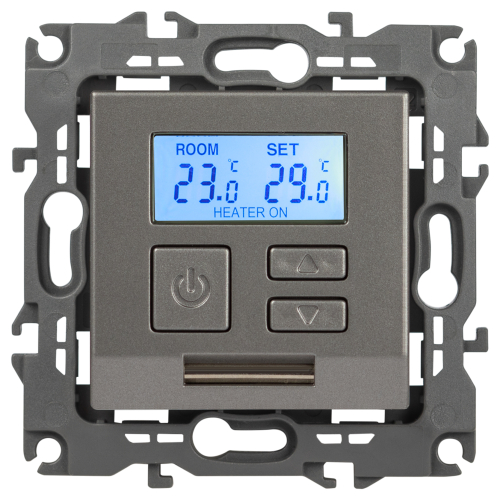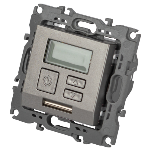 Терморегулятор теплый пол / отопление электронный серии Эра 12 скрытой установки механизм цвет титан 12-4111-16. Номинальные характеристики 16А 230В. Сделан из поликарбоната. Монтаж в подрозетник производится и на лапки, и на винты. Рамки приобретаются отдельно.