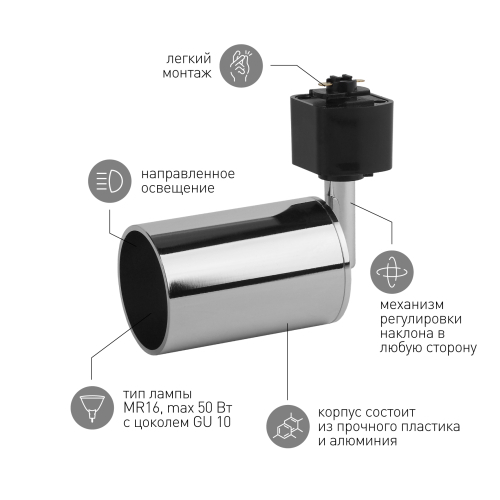 Светодиодный светильник TR14-GU10 CH отличается стильным дизайном. Выполненный в серебристом варианте, светильник станет незаменимым элементом при создании направленного освещения. Он имеет поворотную часть, благодаря чему можно менять направление светового потока в зависимости от ситуации. Источником света выступает лампа с цоколем GU10, благодаря чему можно подбирать необходимую мощность, цветовую температуру и угол рассеивания. Такие светильники легко монтируются, позволяют при необходимости полностью менять восприятие помещения. Трековые светильники компании Эра выдающийся акцент в любом пространстве.