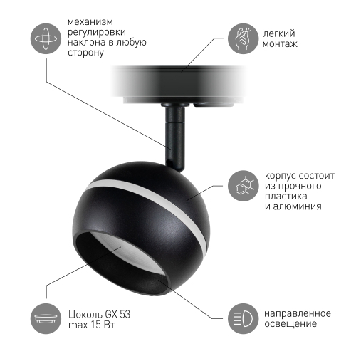 Однофазный трековый светильник под лампу с цоколем GX53 с плоским трековым адаптером. Корпус светильника выполнен из алюминия и пластика. Благодаря возможности использования лампы GX53 светильник можно сделать достаточно ярким, используя лампы 12-15W. Передняя часть плафона выполнена из опалового акрила, который, сужая угол рассеивания и снижая тем самым эффект ослепления, также выполняет декоративную функцию и делает светильник эстетически более привлекательным.