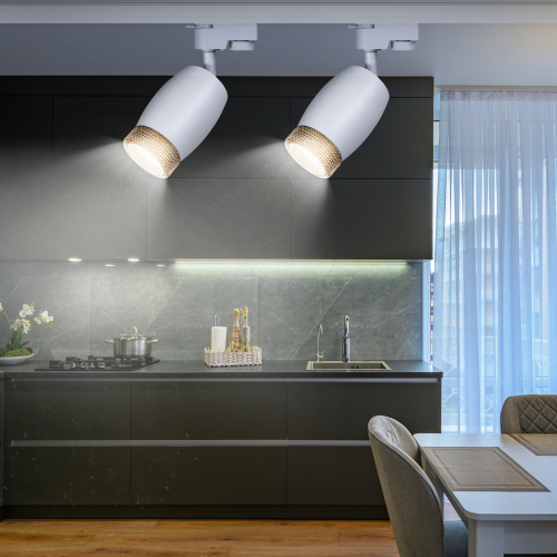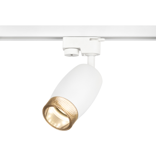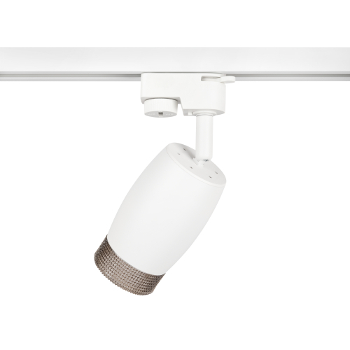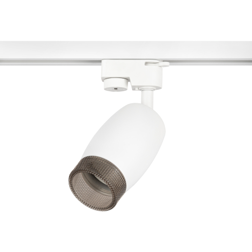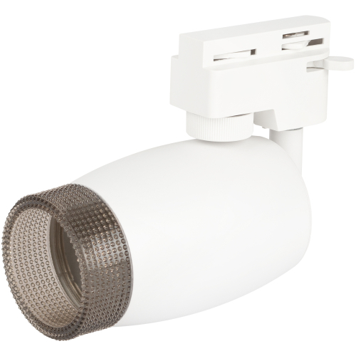 Однофазный трековый светильник под лампу с цоколем GU10. Светильник выполнен из алюминия и пластика. На передней части плафона находится пластиковое кольцо, стилизированное под хрусталь. Во включенном виде данное кольцо наполняется светом и создает превосходный визуальный эффект, а также оно выполняет функцию ограничителя угла рассеивания светового потока, снижая эффект ослепления светом.