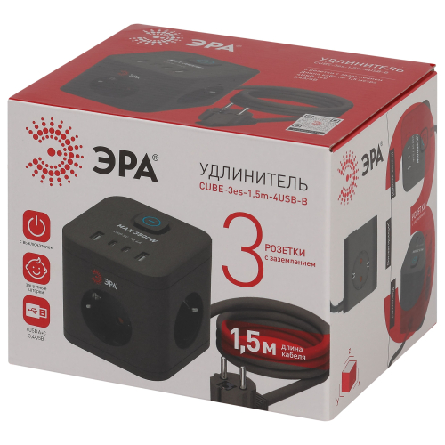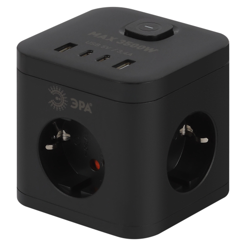 Удлинитель Эра CUBE-3es-1,5m-4USB-B рассчитан на одновременное подключение большого количества техники. На корпусе расположены 3 розетки с заземлением. Прочный корпус в виде башни из негорючего поликарбоната. Трехжильный провод ПВС обеспечивает допустимую максимальную нагрузку до 3500 Вт. Правильно подбирайте бытовые приборы, чтобы не превышать общую нагрузку на сетевой фильтр.4 USB - 2typeA+2typeC 3.4A/5V 18Вт. Длина провода модели составляет 1,5 метра. Удлинитель удобно использовать в пределах одной комнаты.