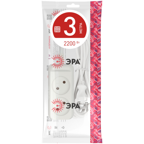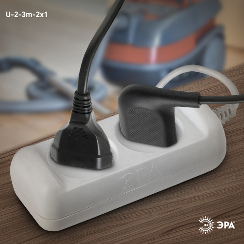 Компактный удлинитель ЭРА U-2-3m-2x1 на 2 розетки, без заземления, с проводом 3 метра. Можно использовать для мощных электроприборов. Максимальная нагрузка - 10 А / 2200 Вт. Изготовлен из надёжного полипропилена со специальными антипиренами, препятствующими горению. Прочный и гибкий двухжильный провод ПВС 2x1мм2. Удобная вилка и аккуратный внешний вид с закруглёнными углами. Эксплуатируется при температурах в помещении от -25 до +40 С.