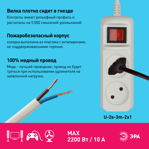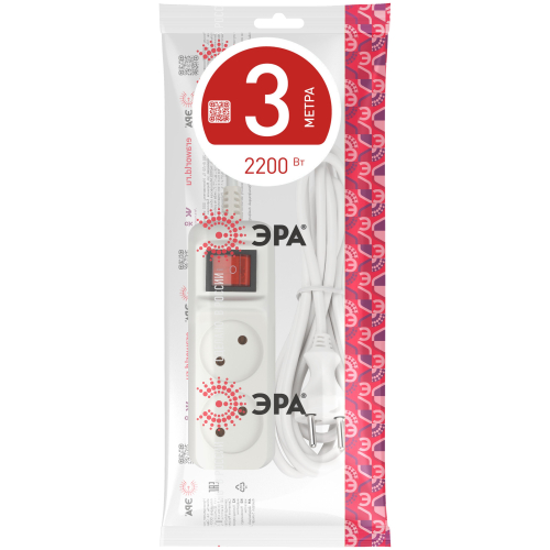 Удлинитель электрический Эра U-2s-3m-2x1 без заземления, с выключателем, ПВС, 2x1мм2, 2 розетки, 3м. Рассчитан на максимальную мощность 10А/2200 Вт. Удлинитель Эра станет Вашим надежным помощником, если Ваши любимые электроприборы находятся далеко от розеток. Провод в удлинителях Эра сделан из 100% меди, что делает его абсолютно пожаробезопасным. Корпус выполнен из ударопрочного и негорючего пластика (полипропилен). Модель удлинителя на 10А позволяет подключить бытовые приборы общей нагрузкой до 2200Вт. Дизайн удлинителя разработан в России командой Эра Style.