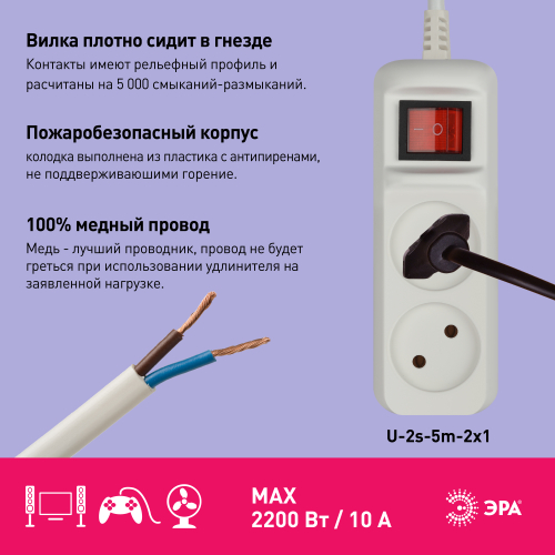 Удлинитель электрический Эра U-2s-3m-2x1 без заземления, с выключателем, ПВС, 2x1мм2, 2 розетки, 5м. Рассчитан на максимальную мощность 10А/2200 Вт. Удлинитель Эра станет Вашим надежным помощником, если Ваши любимые электроприборы находятся далеко от розеток. Провод в удлинителях Эра сделан из 100% меди, что делает его абсолютно пожаробезопасным. Корпус выполнен из ударопрочного и негорючего пластика (полипропилен). Модель удлинителя на 10А позволяет подключить бытовые приборы общей нагрузкой до 2200Вт. Дизайн удлинителя разработан в России командой Эра Style.