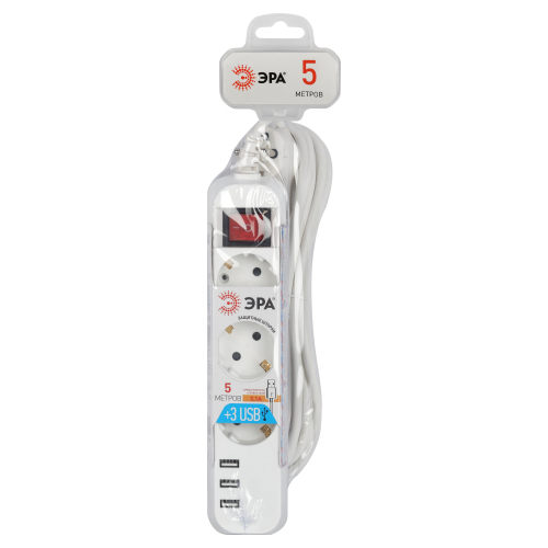 Удлинитель электрический ЭРА U-3es-5m-USB с заземлением, с выключателем, 3 розетки, 5м ПВС 3x0,75мм2. Рассчитан на максимальную мощность 10А/2200Вт. С 3-мя USB гнездами (Type A) для зарядки портативных устройств. Максимальная мощность USB разъемов: 3100 мА.