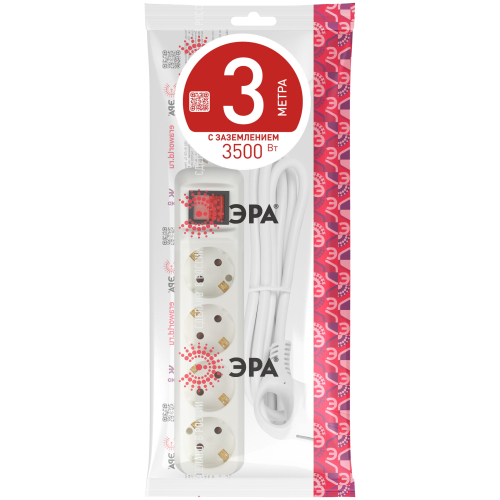 Удлинитель электрический Эра U-4es-3m с заземлением, с выключателем, ПВС, 3x1мм2, 4 розетки, 3 метра. Рассчитан на максимальную мощность 16А/3500 Вт. Удлинитель Эра станет Вашим надежным помощником, если Ваши любимые электроприборы находятся далеко от розеток. Провод в удлинителях Эра сделан из 100% меди, что делает его абсолютно пожаробезопасным. Корпус выполнен из ударопрочного и негорючего пластика (полипропилен). В моделях с заземлением у вилки есть кольцо для удобного извлечения из розетки. Модель удлинителя на 16А позволяет подключить мощные бытовые приборы общей нагрузкой до 3500Вт. Не бойтесь включить чайник, обогреватель, микроволновку или другие электроприборы. Толстый провод удлинителя Эра гарантирует полную безопасность. Дизайн удлинителя разработан в России командой Эра Style.
