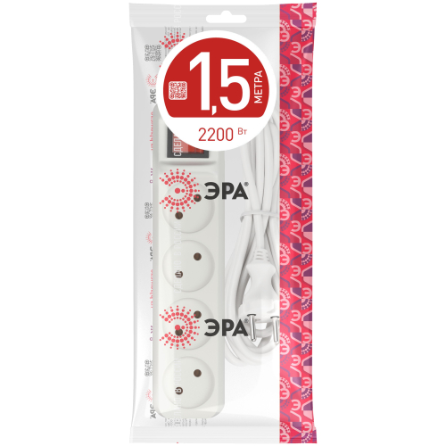 Удлинитель электрический Эра U-4s-1,5m-2x1 без заземления, с выключателем, ПВС, 2x1мм2, 4 розетки, 1,5 м. Рассчитан на максимальную мощность 10А/2200 Вт. Удлинитель Эра станет Вашим надежным помощником, если Ваши любимые электроприборы находятся далеко от розеток. Провод в удлинителях Эра сделан из 100% меди, что делает его абсолютно пожаробезопасным. Корпус выполнен из ударопрочного и негорючего пластика (полипропилен). Модель удлинителя на 10А позволяет подключить бытовые приборы общей нагрузкой до 2200Вт. Дизайн удлинителя разработан в России командой Эра Style.