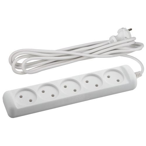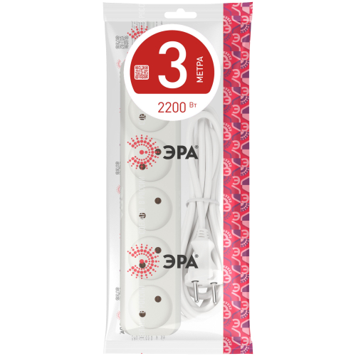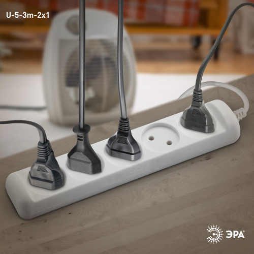 Удлинитель электрический Эра U-5-3m без заземления, ПВС, 2x1мм2, 5 розеток, 3м. Рассчитан на максимальную мощность 10А/2200 Вт. Удлинитель Эра станет Вашим надежным помощником, если Ваши любимые электроприборы находятся далеко от розеток. Провод в удлинителях Эра сделан из 100% меди, что делает его абсолютно пожаробезопасным. Корпус выполнен из ударопрочного и негорючего пластика (полипропилен). В моделях с заземлением у вилки есть кольцо для удобного извлечения из розетки. Модель удлинителя на 10А позволяет подключить мощные бытовые приборы общей нагрузкой до 2200Вт. Не бойтесь включить чайник, обогреватель, микроволновку или другие электроприборы. Толстый провод удлинителя Эра гарантирует полную безопасность. Дизайн удлинителя разработан в России командой Эра Style.