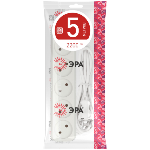 Удлинитель электрический Эра U-5-5m без заземления, ПВС, 2x1мм2, 5 розеток, 5м. Рассчитан на максимальную мощность 10А/2200 Вт. Удлинитель Эра станет Вашим надежным помощником, если Ваши любимые электроприборы находятся далеко от розеток. Провод в удлинителях Эра сделан из 100% меди, что делает его абсолютно пожаробезопасным. Корпус выполнен из ударопрочного и негорючего пластика (полипропилен). В моделях с заземлением у вилки есть кольцо для удобного извлечения из розетки. Модель удлинителя на 10А позволяет подключить мощные бытовые приборы общей нагрузкой до 2200Вт. Не бойтесь включить чайник, обогреватель, микроволновку или другие электроприборы. Толстый провод удлинителя Эра гарантирует полную безопасность. Дизайн удлинителя разработан в России командой Эра Style.