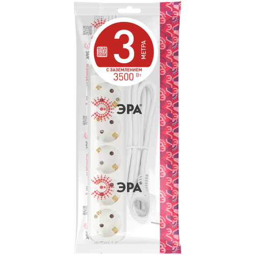 Удлинитель электрический Эра U-5e-3m-3x1 с заземлением, ПВС, 3x1мм2, 5 розеток, 3 м. Рассчитан на максимальную мощность 16А/3500 Вт. Удлинитель Эра станет Вашим надежным помощником, если Ваши любимые электроприборы находятся далеко от розеток. Провод в удлинителях Эра сделан из 100% меди, что делает его абсолютно пожаробезопасным. Корпус выполнен из ударопрочного и негорючего пластика (полипропилен). В моделях с заземлением у вилки есть кольцо для удобного извлечения из розетки. Модель удлинителя на 16А позволяет подключить мощные бытовые приборы общей нагрузкой до 3500Вт. Не бойтесь включить чайник, обогреватель, микроволновку или другие электроприборы. Толстый провод удлинителя Эра гарантирует полную безопасность. Дизайн удлинителя разработан в России командой Эра Style.